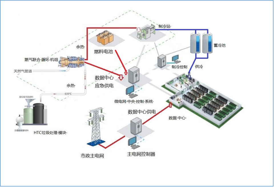 取代柴油機(jī)備份電源,大大降低冗余供電設(shè)施的規(guī)模,并充分利用已建成的冗余供電設(shè)施為數(shù)據(jù)中心的制冷模塊供電和供熱,降低數(shù)據(jù)中心的運(yùn)營成本;